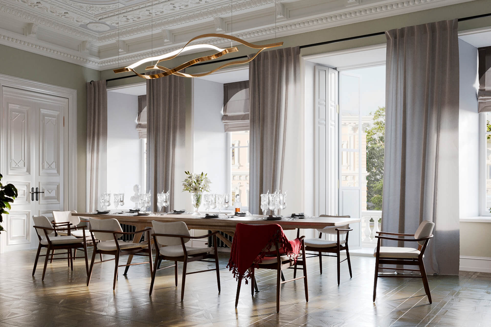 В интерьерах сохранены оригинальные камины, лепные украшения, мраморные подоконники и высокие деревянные двери, которые были бережно реставрированы. Эти детали подчёркивают аутентичность пространства и делают его неповторимым.